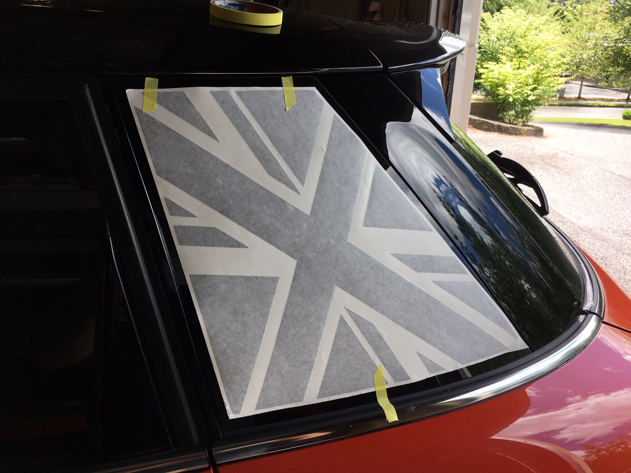 - Once the decal is completely positioned and squeegeed down, go around to the other side of your MINI and perform the same steps. This will give the solution time to evaporate a bit and allow the decal adhere to the surface. After you've applied the decal to the second side of your MINI, go back around to the first side and starting at the top corner, begin to peel the transfer paper off of it. Pull the paper back upon itself at an extreme angle to minimize the potential of lifting the decal off the surface of the glass. If it does begin to pull up with the paper.. don’t be too concerned. Apply the microfiber side of the squeegee directly onto the decal and press it back down. Do not use the plastic edge of the squeegee directly on the vinyl as you'll risk scratching it.