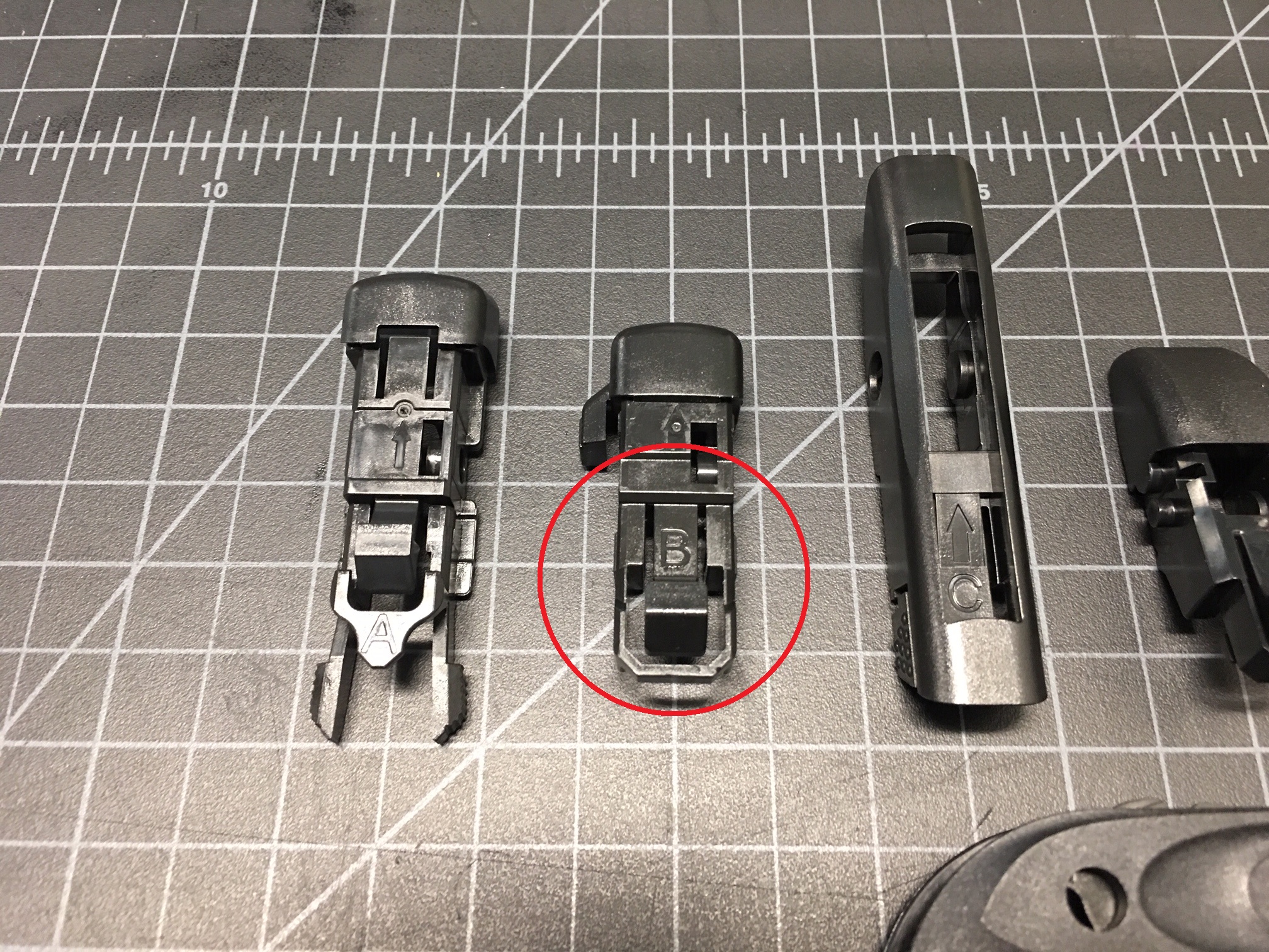 - Next, fit the adapter marked 'B' over the 'M' adapter and click them together. Note the mating orientation of the two pieces.