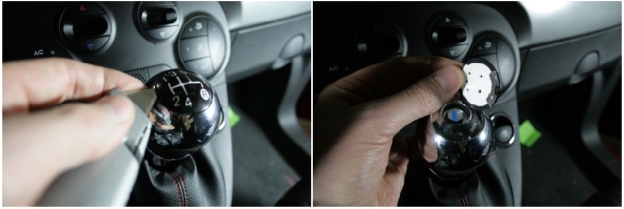 1) Use a knife to gently lift off the shift-patterned plastic covering the retainer bolt on the OEM shift knob. This cover is held in place with double-sided adhesive tape.
