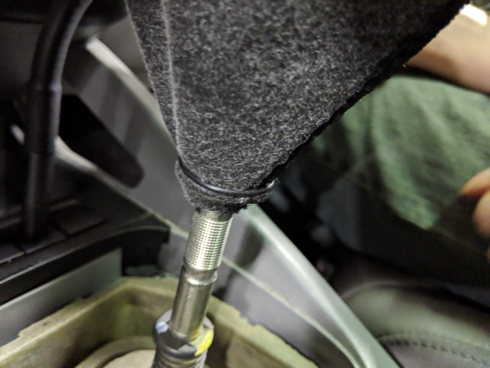 - First, slide the o-ring onto the shifter shaft. Later we'll use this to secure the boot to the new knob. Then slide the boot and trim piece back on. Don't pop it back in just yet.
