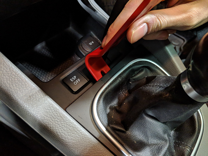- First up, we need to pop the trim piece that the bottom of the boot is attached to out of the center console. Start by prying up the trim with the trim panel tool. Work your way around the perimeter of the piece. Eventually you will be able to simply reach under the lip of the piece on the boot side and just pull it straight out.