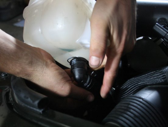 7. Drain the coolant expansion tank using a transfer pump or by siphoning. Alternatively, the coolant can be drained into a pan placed below the car by disconnecting the hose on the bottom of the tank (this method can get a bit messy).