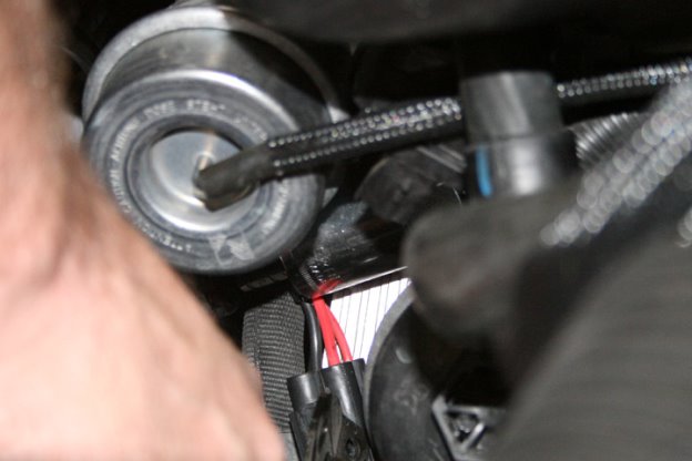 11. Remove the wiring connector by pushing on the plastic lock tab and gently pulling it off the factory oil pressure sensor.