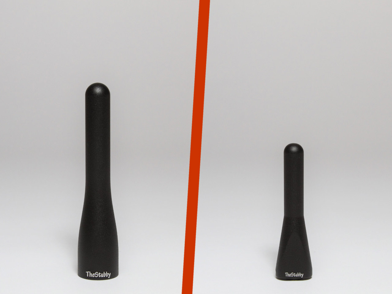 The Stubby antenna replacement comes in 3 styles, each one is tailor fit to it’s specific application. The Original Stubby ranges from about 3-4 inches, depending on the vehicle. The Stubby Jr’s are 2 inches tall to be sure to fit under your garage door. The Bullet Style Stubby is between 4.25 and 5.5 inches (.338 or .50 cal), again depending on the vehicle. They are also anodized, rather than powder coated. To see exactly what size your's will be, just select your model in the drop down menus above.